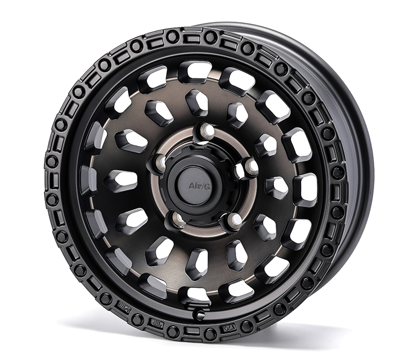 また、ホイールのリム(外周)部分にはシルバーのリムボルトを多数配置し、ホイールの存在感を増しています。近年のオーバーランダースタイルで架装したルーフや、バンパーのボリュームが大きい車両の足元でも、Air/G VULCAN(ヴァルカン)は際立つ存在感を放ちます。